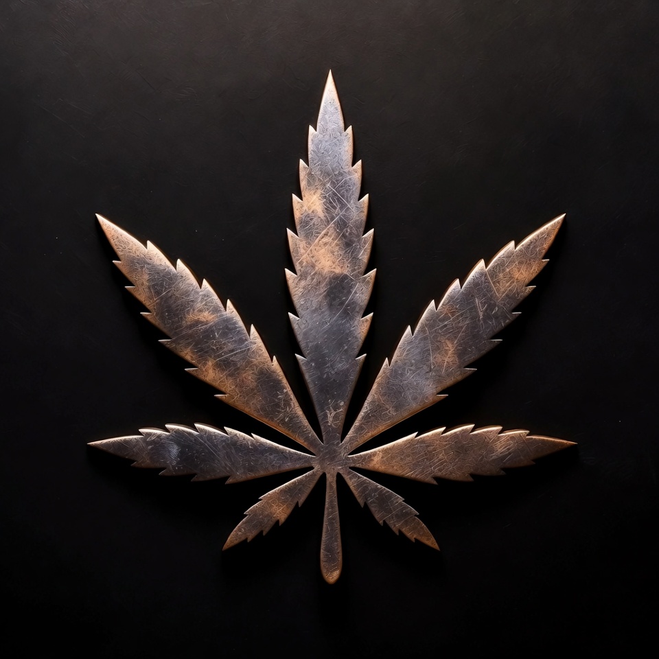 A detailed metal sculpture of a cannabis leaf rests against a dark background, highlighting its unique shape and texture.