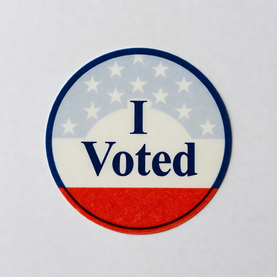 A round sticker shows the text I Voted in bold letters, with red, white, and blue colors and a star pattern. It symbolizes civic duty.
