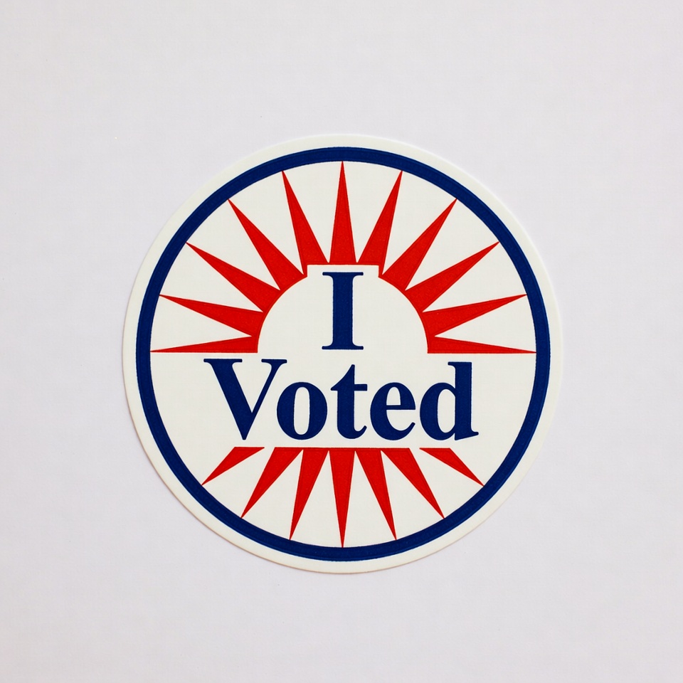 A circular sticker features a bold I Voted message with a sunburst pattern in red and blue colors, symbolizing civic engagement and participation.