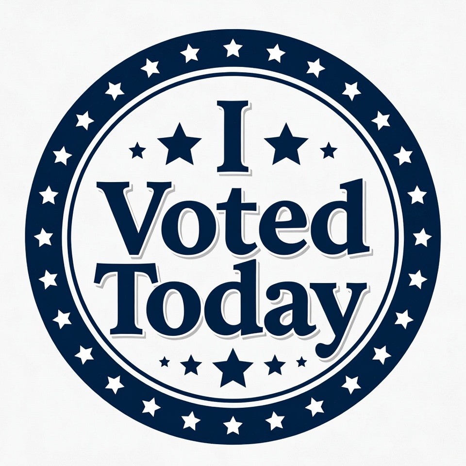 A circular sticker with bold text stating I Voted Today, surrounded by stars, symbolizing participation in the democratic process.
