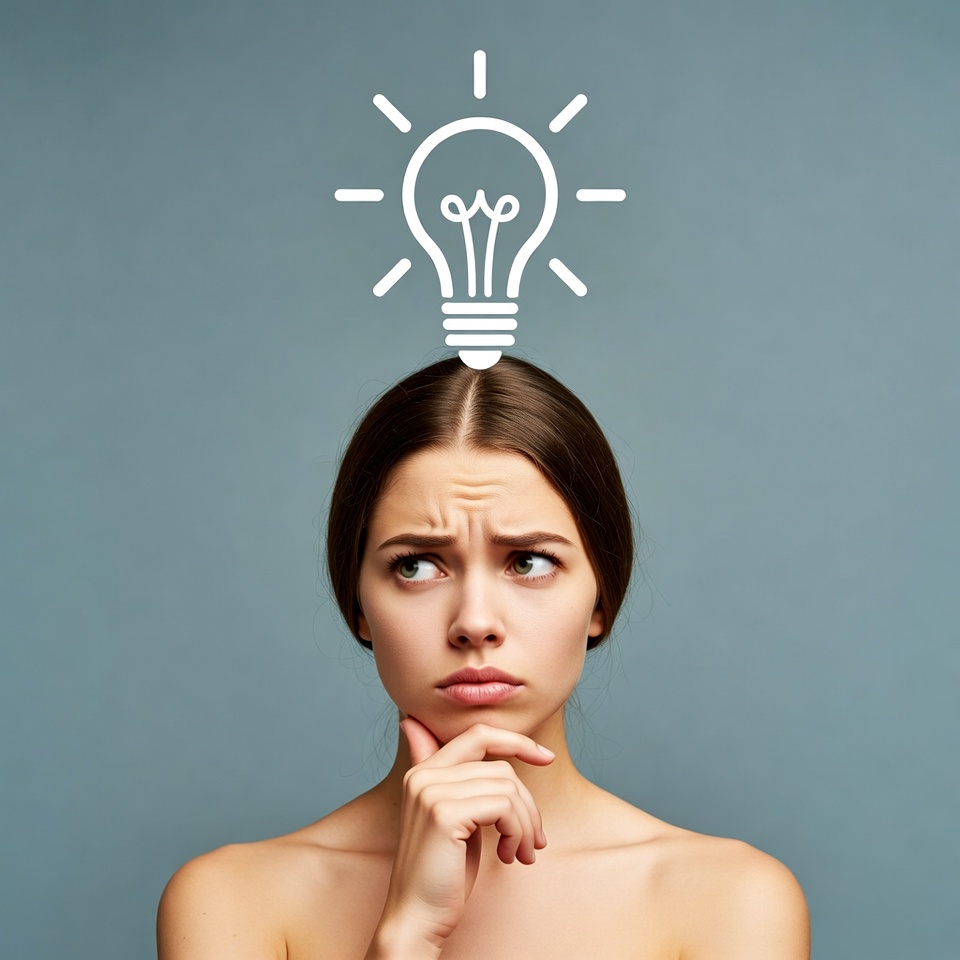 A woman ponders an idea, resting her chin on her hand, with a lightbulb illustration above her head against a simple blue background.