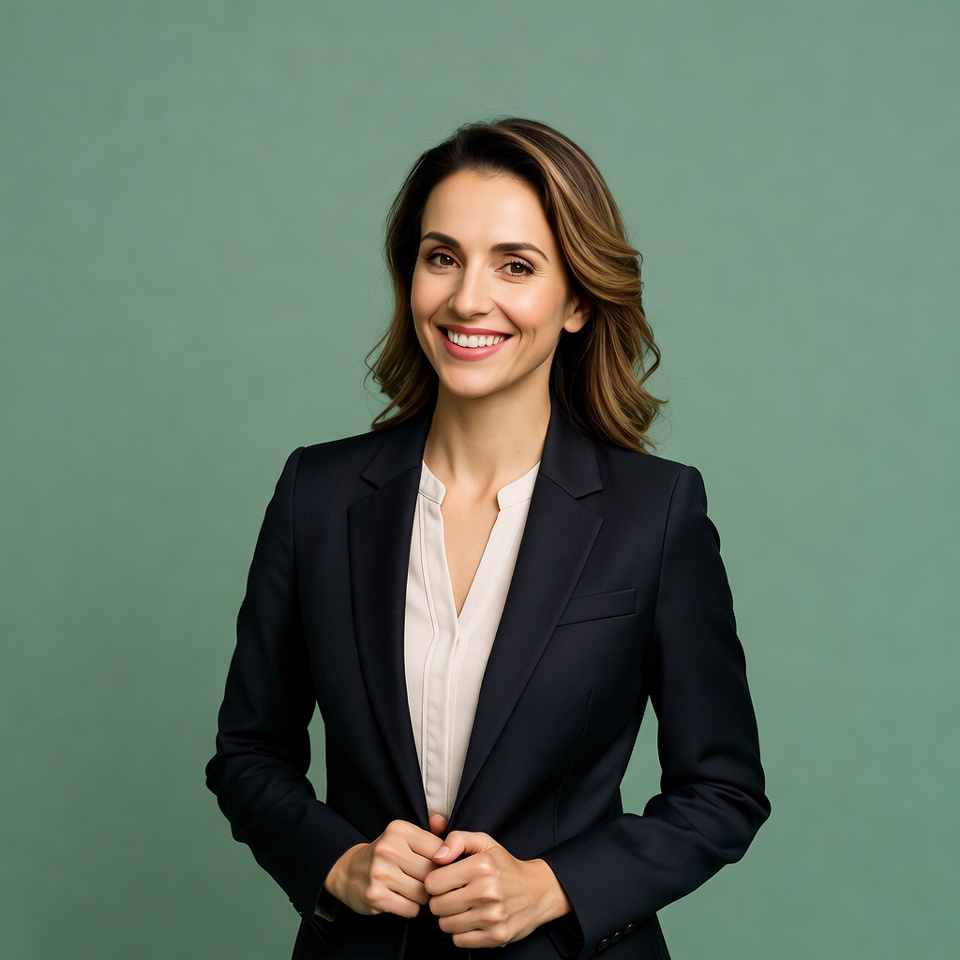 A confident woman in a dark suit stands against a soft green background, smiling and exuding professionalism and approachability.