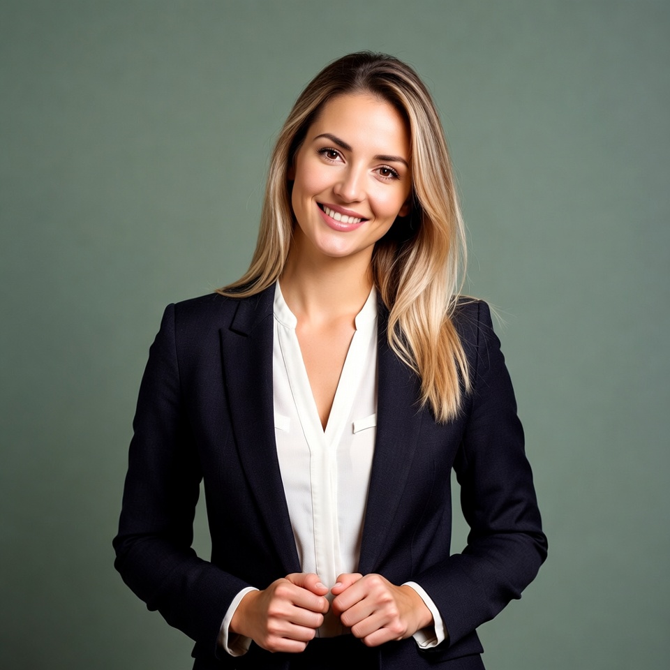 A young woman smiles warmly while wearing a dark suit. She stands against a simple green background, projecting professionalism and confidence.