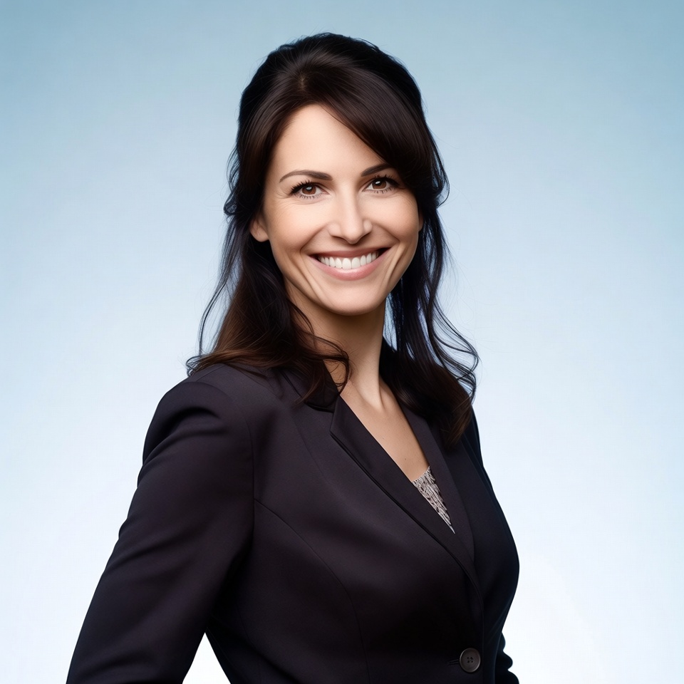 A confident woman in a black suit smiles warmly against a light blue background, showcasing her professional demeanor and positive energy.