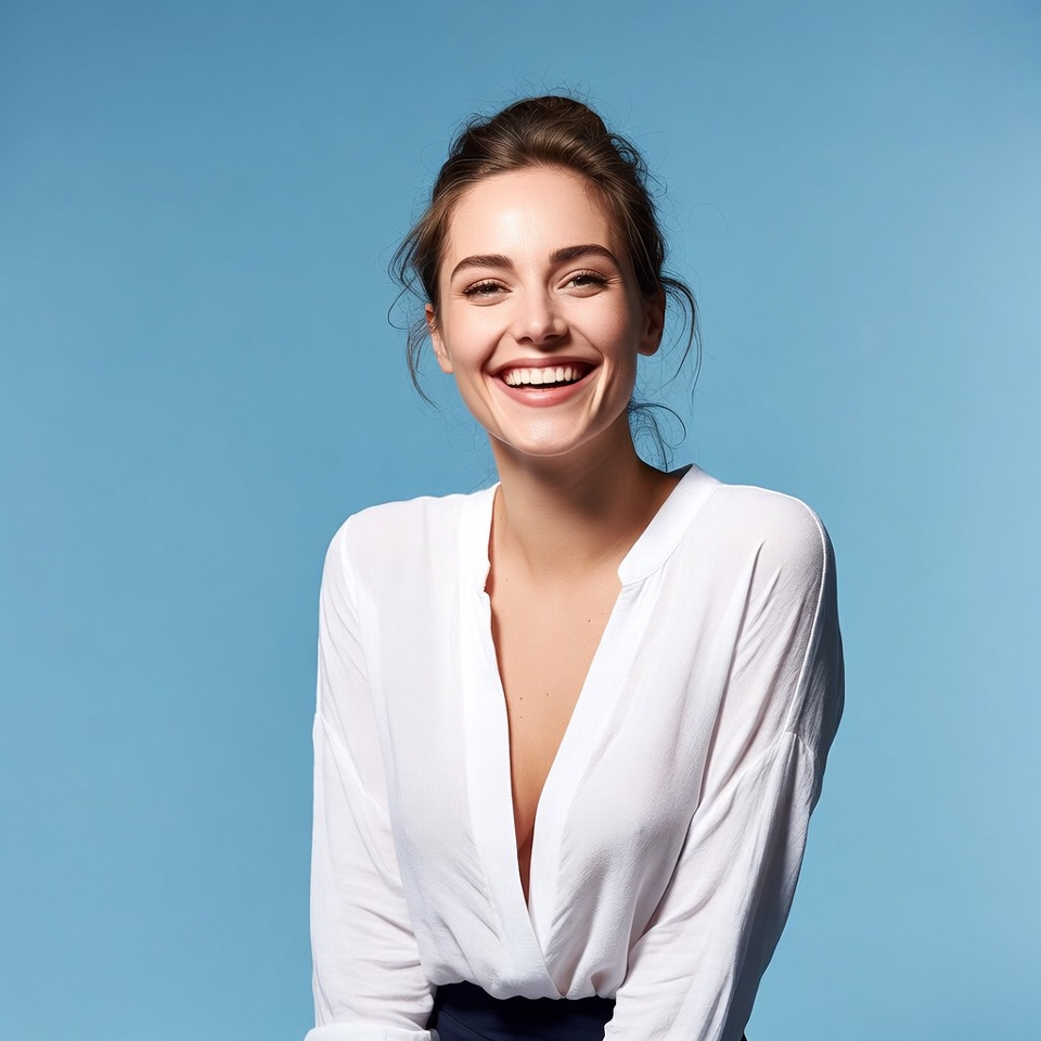 A young woman joyfully smiles while sitting against a light blue background. Her relaxed outfit and cheerful expression radiate happiness.