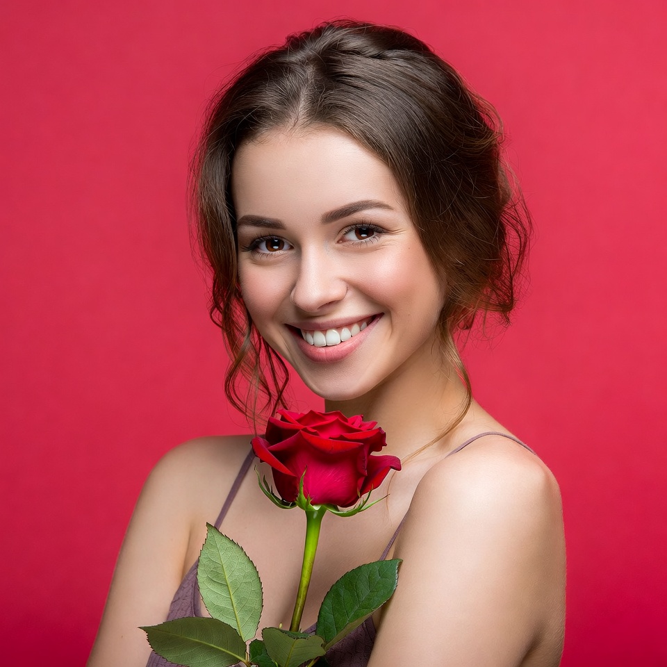 A young woman with a bright smile stands against a pink background, holding a red rose in her hands with an elegant pose.