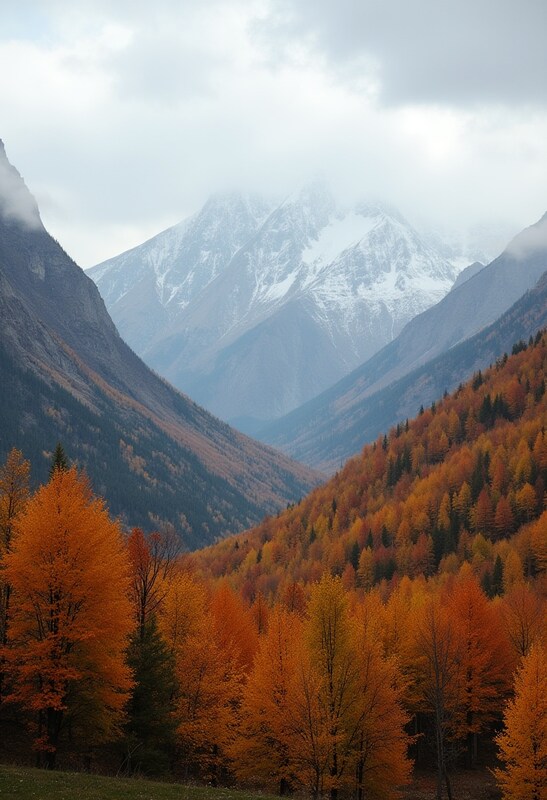 alpine, autumn, cloudy skies, cold weather, fall colors, forest, hiking, landscape, mist, mountains, nature, orange trees, peaks, scenery, scenic, snowy peaks, tranquility, travel, valley, wilderness