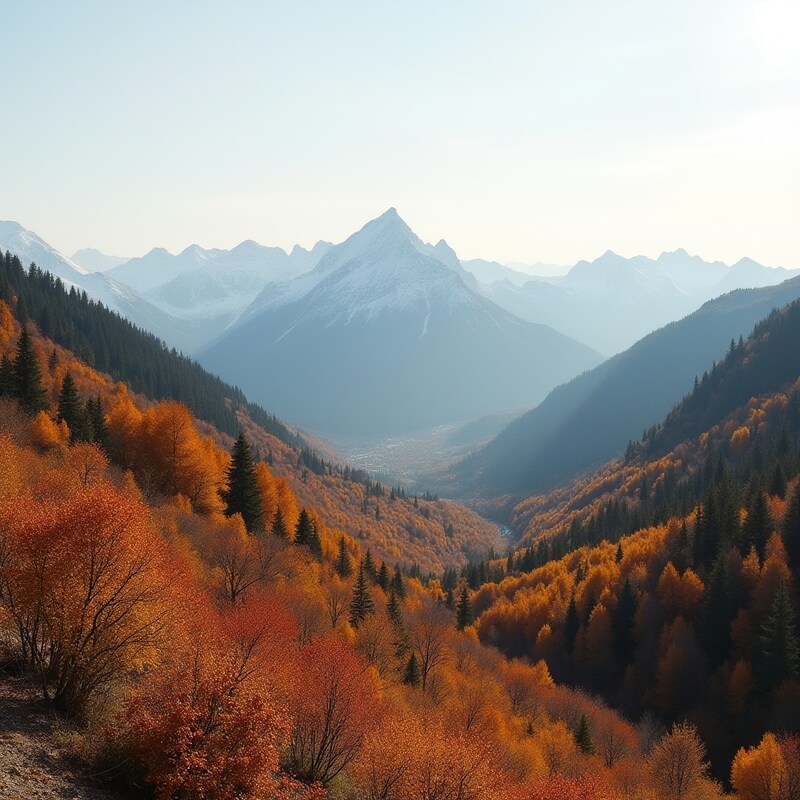 Scenic view of a mountain valley with vibrant autumn foliage. Snow-capped peaks rise above a carpet of orange and gold trees.