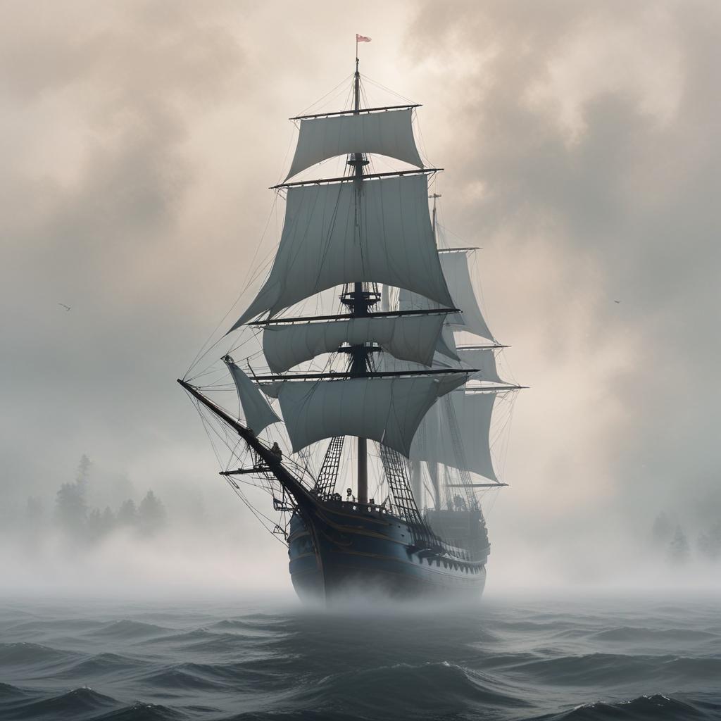 A tall ship with billowing sails navigates through thick fog, creating a mysterious atmosphere on the water at dawn.