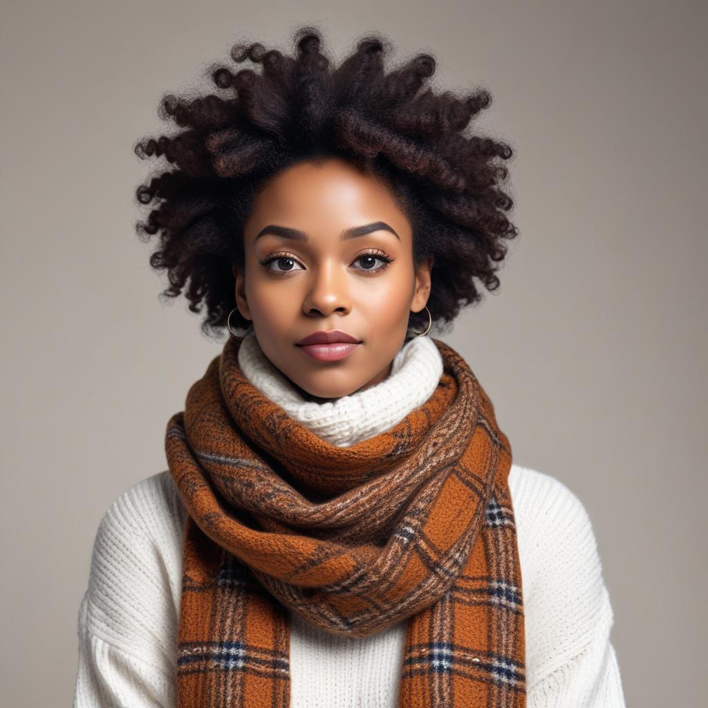 accessories, beauty, casual, confidence, cozy, curly hair, ethnic, fashion, hairstyle, indoor, layers, model, plaid, portrait, scarf, style, sweater, warm clothing, winter, woman