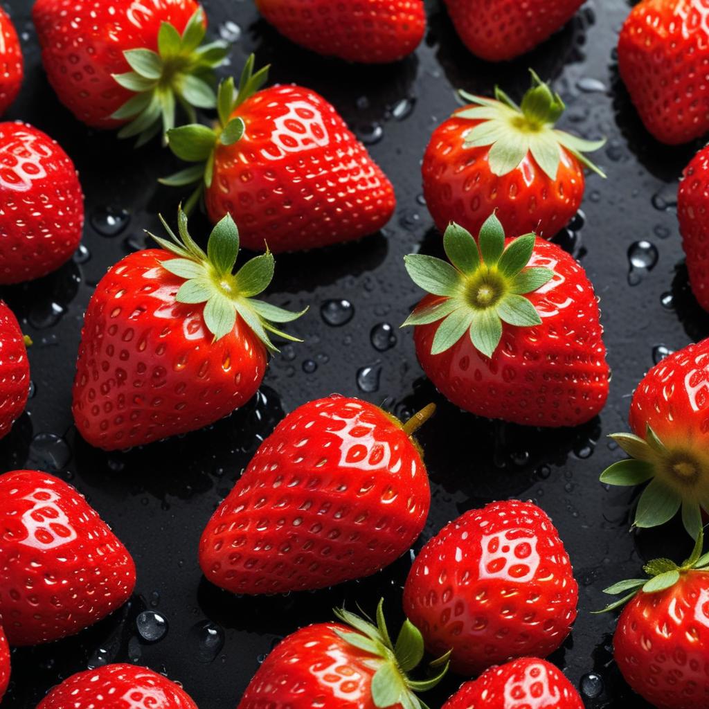 Juicy, ripe strawberries are scattered on a shiny dark surface, glistening with droplets of water, perfect for a summer snack.