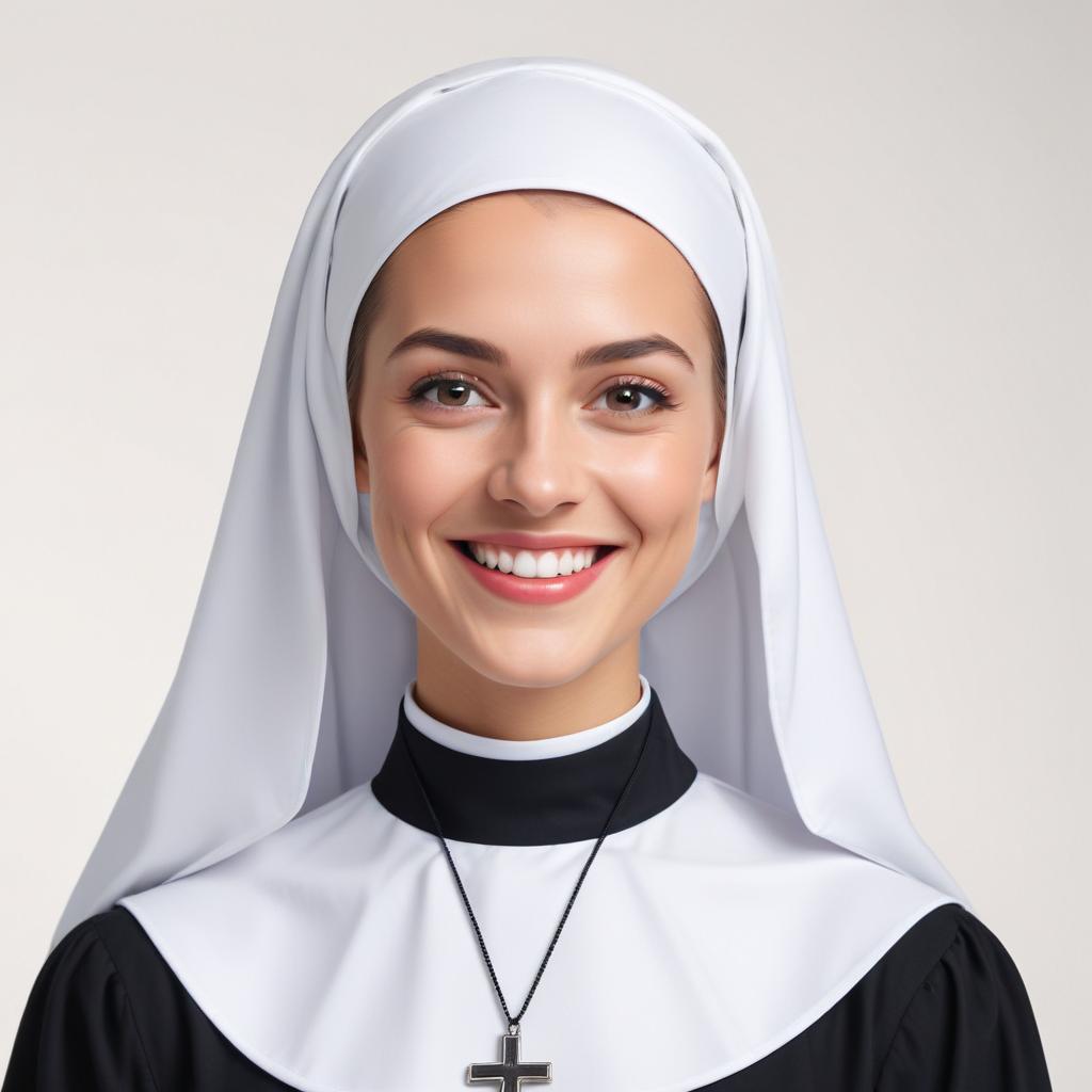A young nun with a bright smile wears a black and white habit. She stands against a neutral background, radiating warmth and kindness.