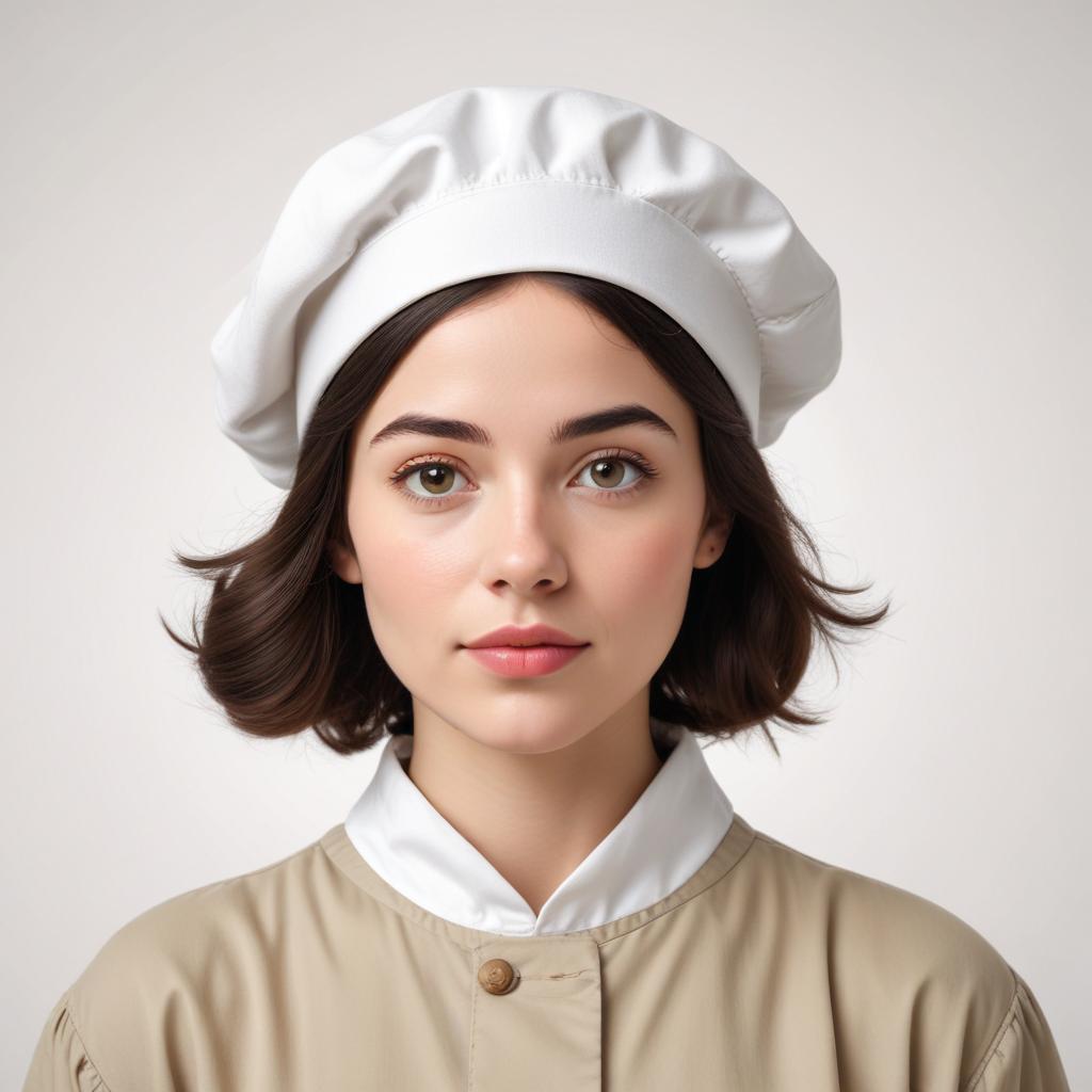 A young chef stands confidently, wearing a white hat and coat. Her expression suggests skill and passion for cooking.