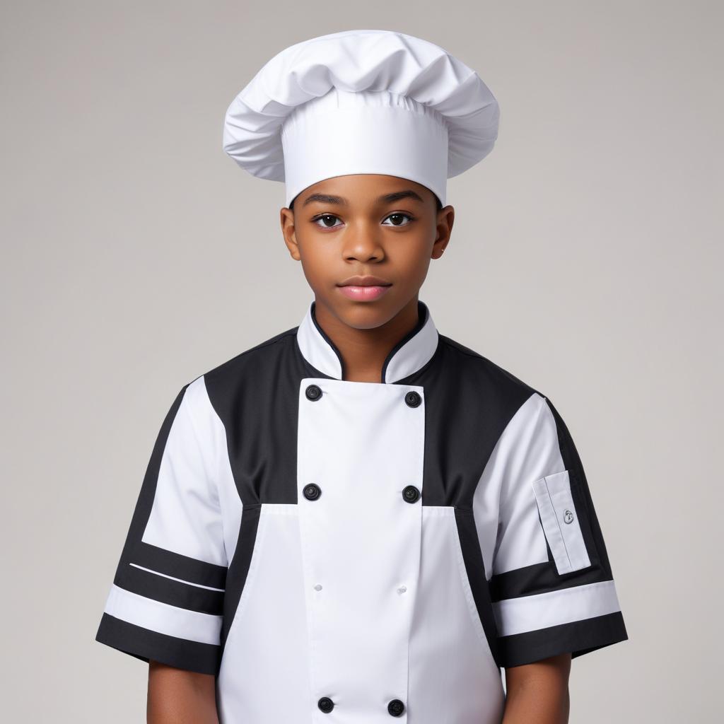 A young chef stands confidently in a professional uniform, showcasing a dedication to culinary arts in a simple setting.