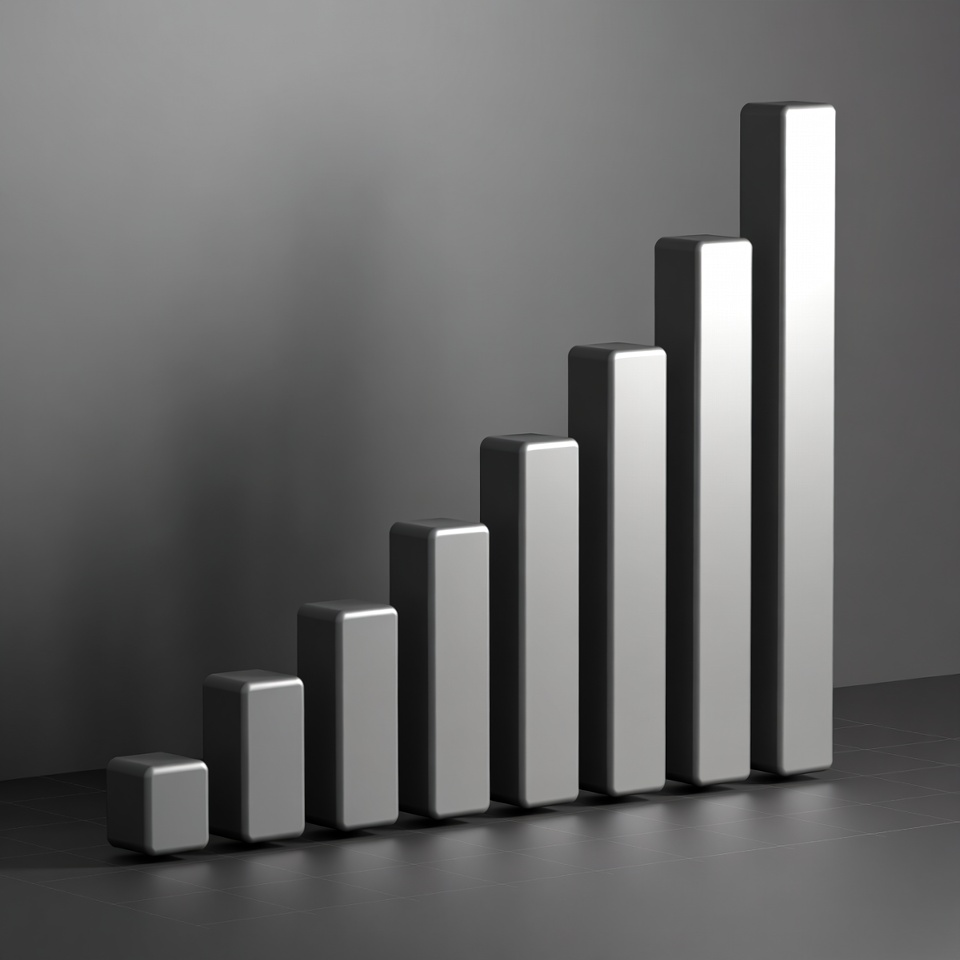 A sleek metallic bar chart represents steady growth with ascending bars. Each bar shows a measurable increase, reflecting success and progress.