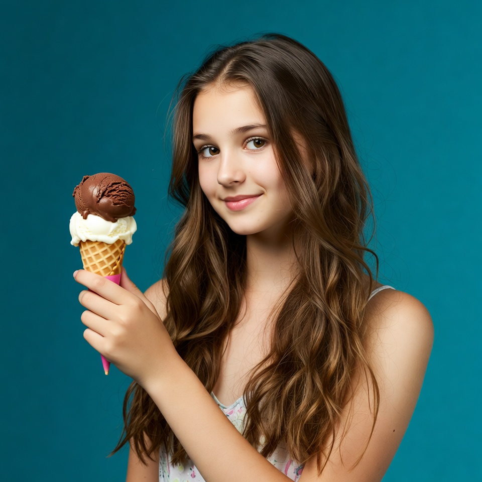 Young girl with long brown hair smiles while holding a chocolate ice cream cone against a blue background. She looks happy.