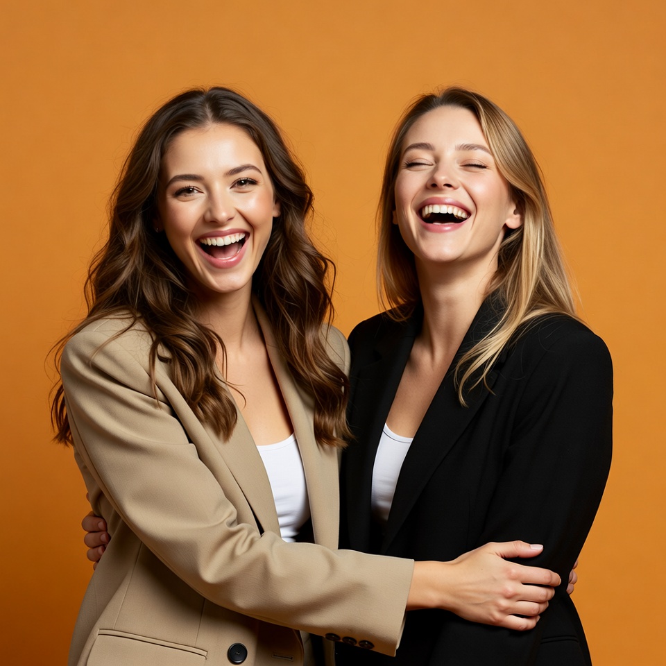 Two women laugh together against a bright orange background, showcasing their friendship and happiness during a cheerful moment.
