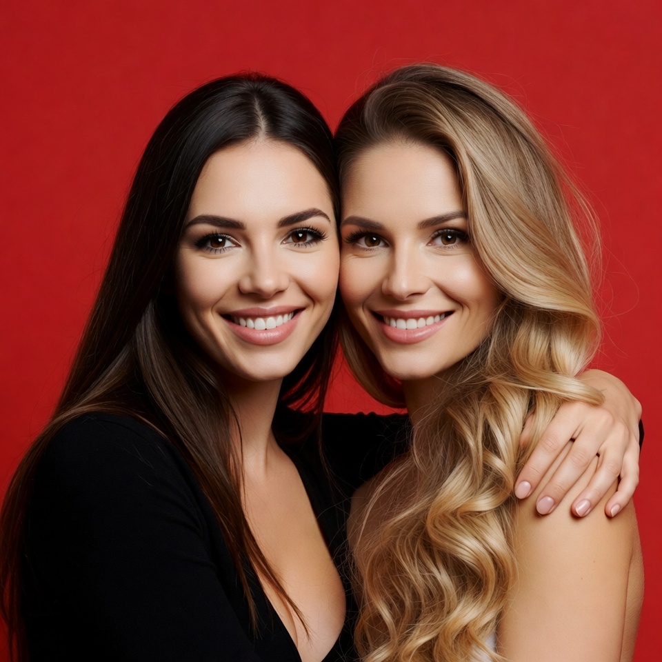 Two women are smiling brightly while posing closely together. They stand against a vibrant red background, sharing a joyful moment.