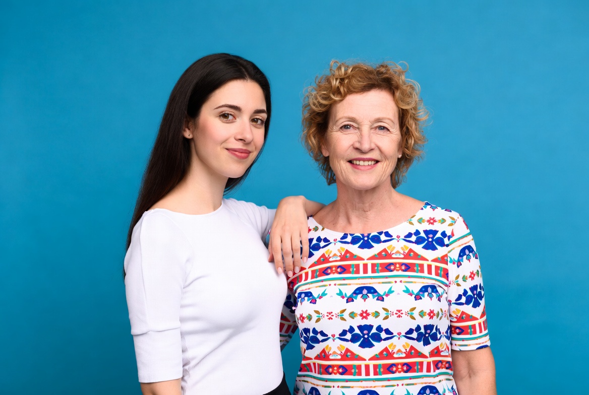Two women pose together with smiles against a vibrant blue background. They appear happy and connected, showcasing a bond between them.