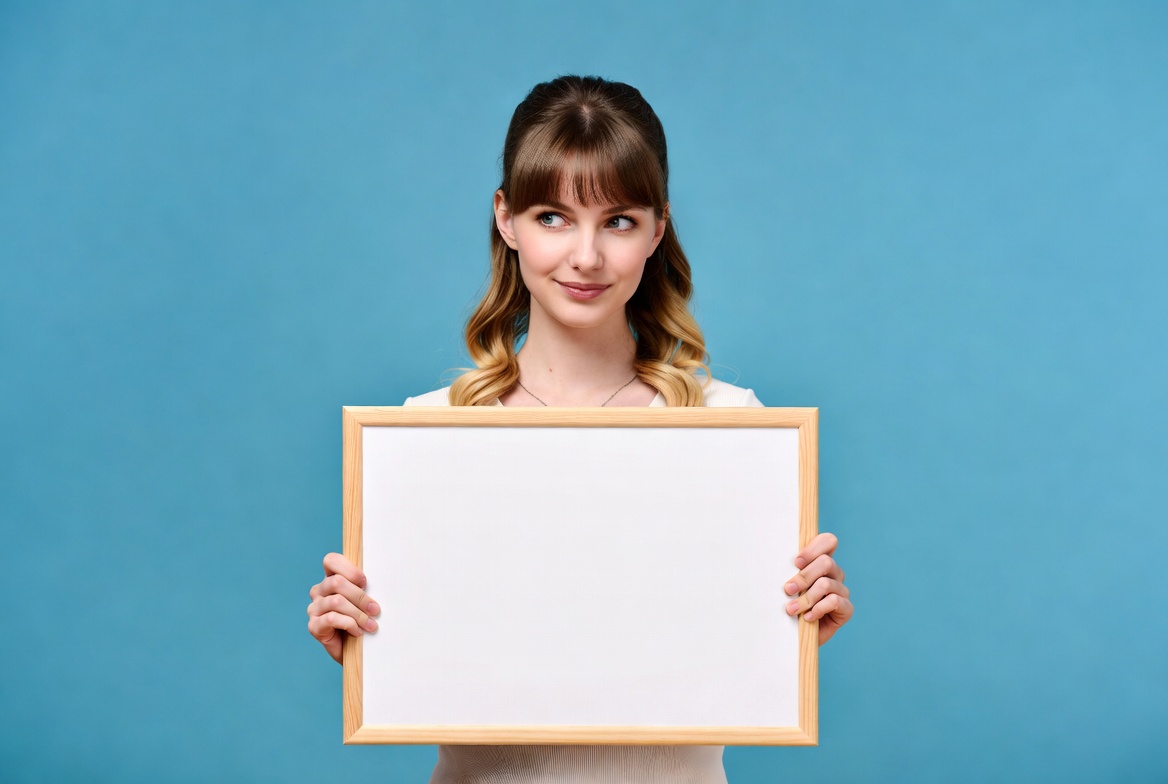 A woman stands against a blue background, holding a blank wooden frame, expressing curiosity and playfulness in her pose and expression.