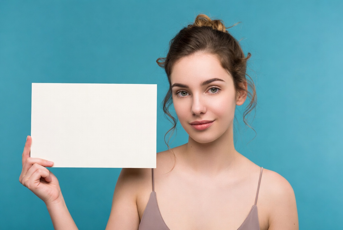 A young woman stands against a blue background, smiling as she holds up a blank sign. Her casual pose invites creativity and engagement.
