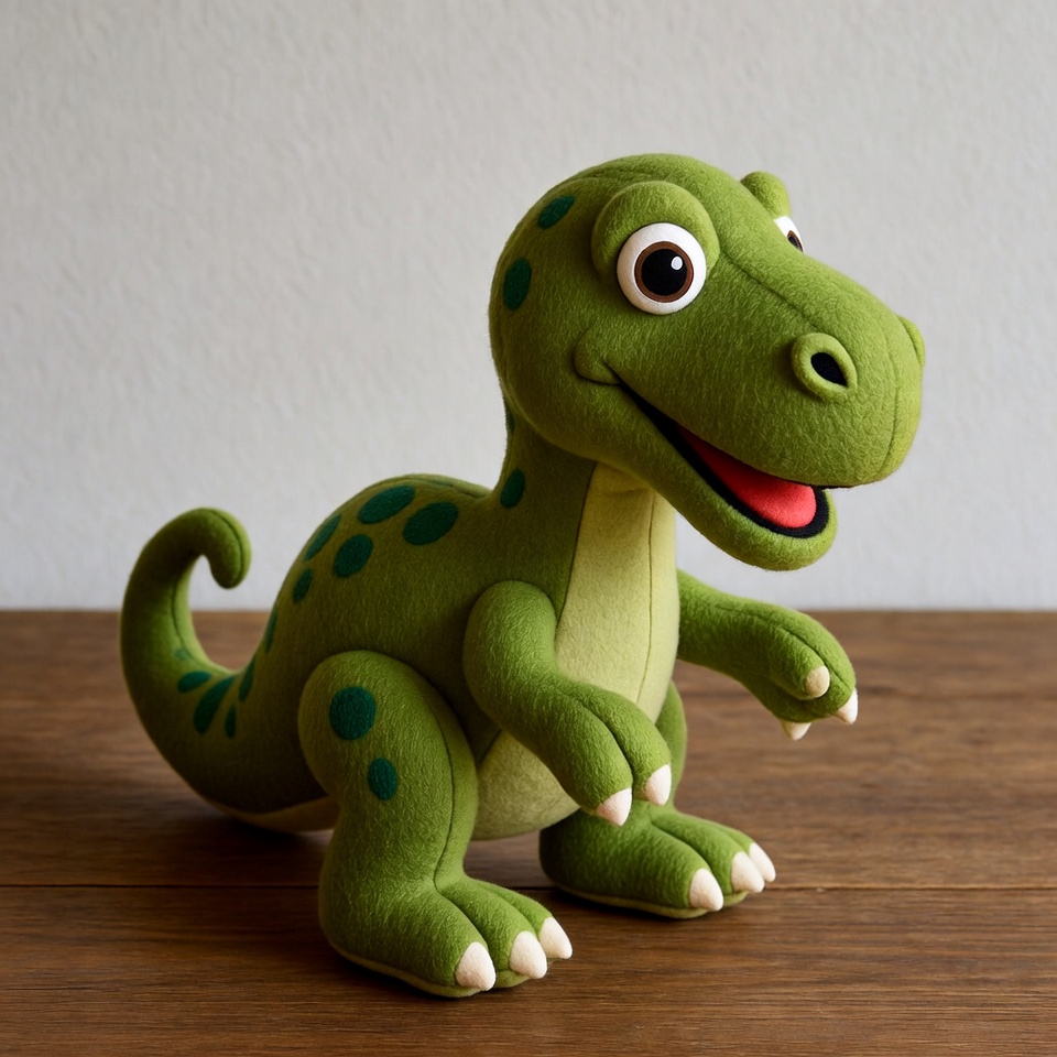 A soft green dinosaur plush toy sits on a wooden table. It features bright eyes and a friendly smile, making it an adorable companion.