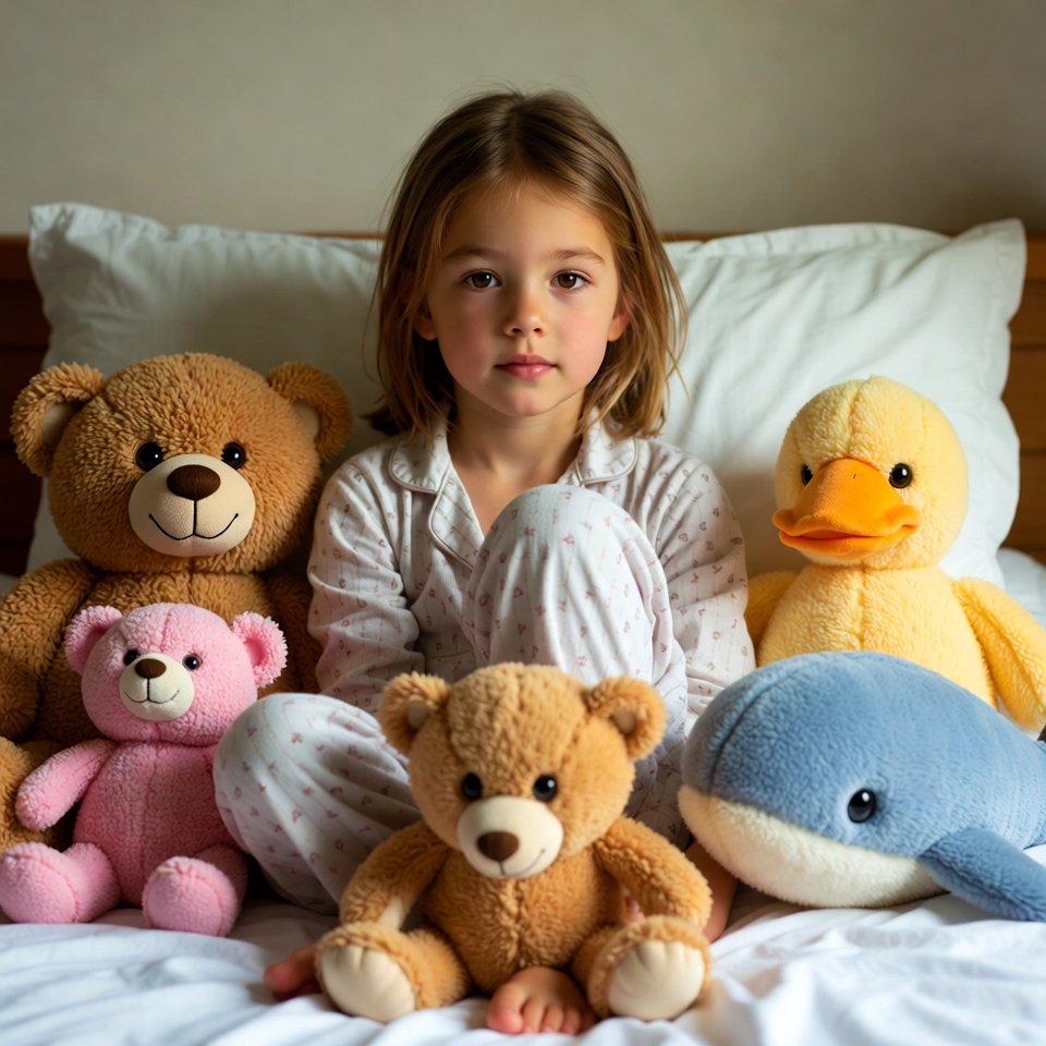 A young child sits on a bed surrounded by colorful stuffed animals, including bears, a duck, and a whale, wearing cozy pajamas.