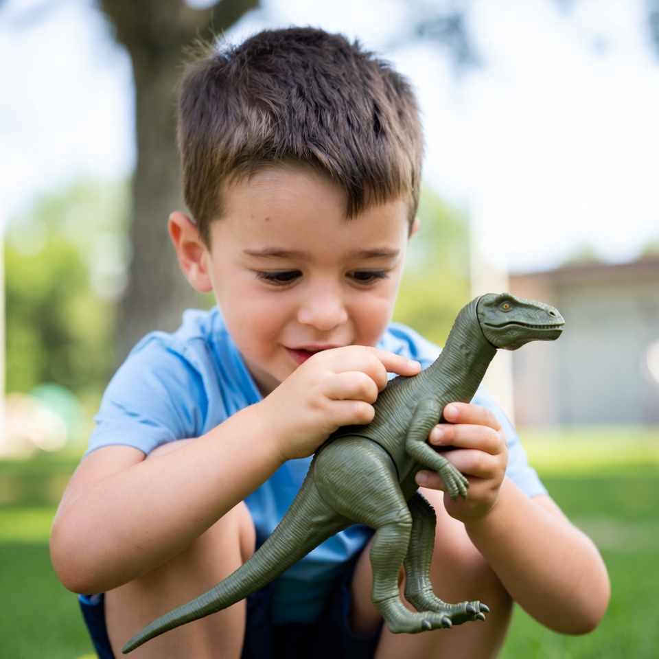 A young boy is happily playing with a dinosaur toy in a green park on a sunny day, exploring his imagination and creativity.