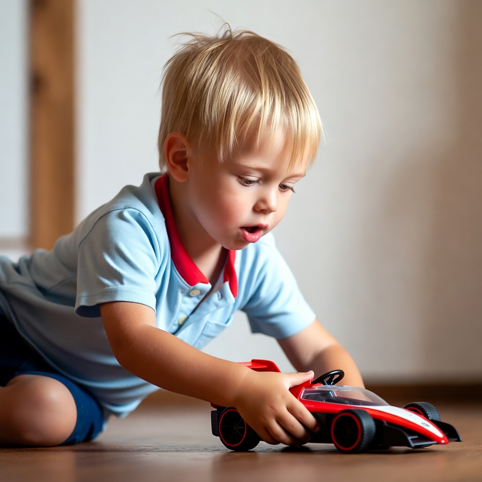 A little boy focuses on his red toy car while sitting on the floor. Sunlight brightens the room, creating a warm atmosphere.
