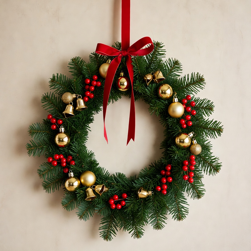 A festive wreath hangs against a light wall, adorned with red berries, golden ornaments, and bells, perfect for seasonal decorations.