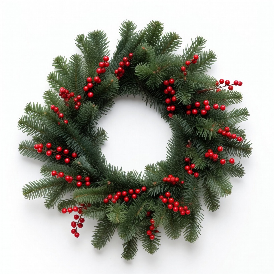 A lovely green wreath adorned with bright red berries creates a festive ambiance. It is perfect for holiday decor and seasonal celebrations.