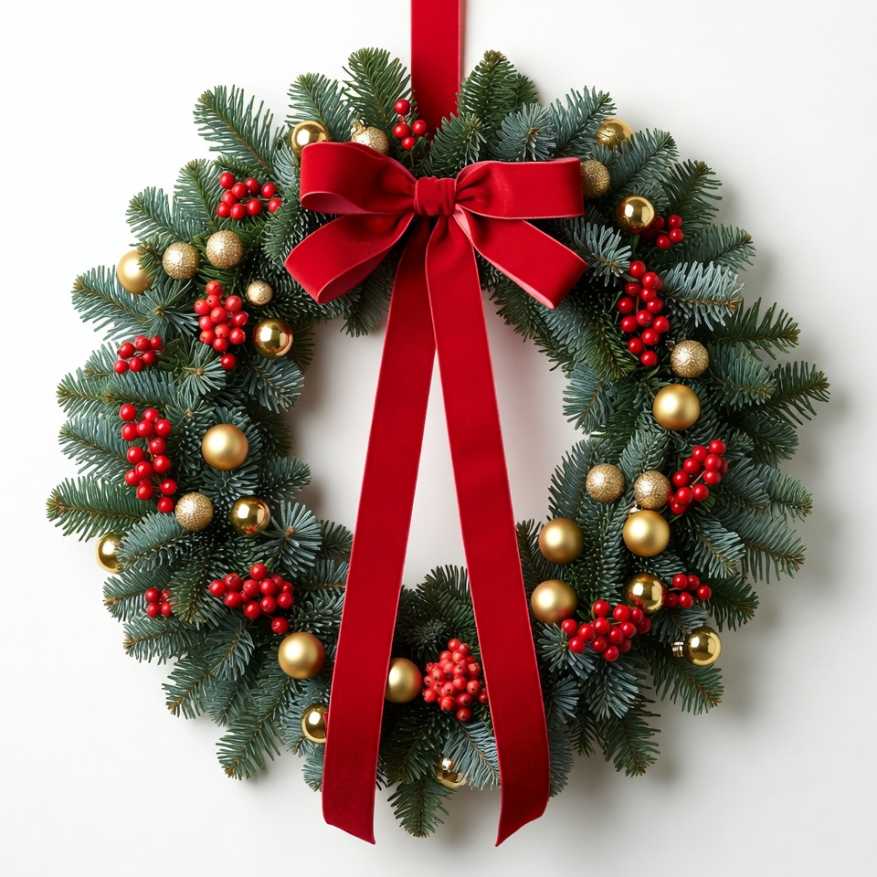 This beautiful wreath features green pine branches adorned with red berries, golden ornaments, and a large red bow, perfect for seasonal decor.