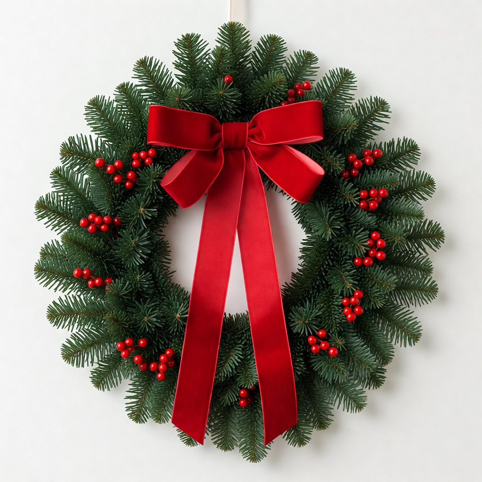 A festive holiday wreath hangs on a white wall. It features green pine branches, red berries, and a large red bow, perfect for seasonal decor.