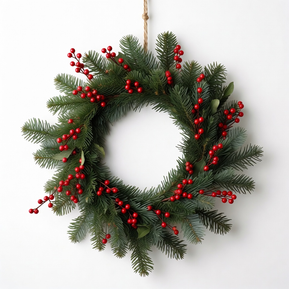 Green wreath adorned with bright red berries is hanging against a white background, bringing a festive touch to the space.
