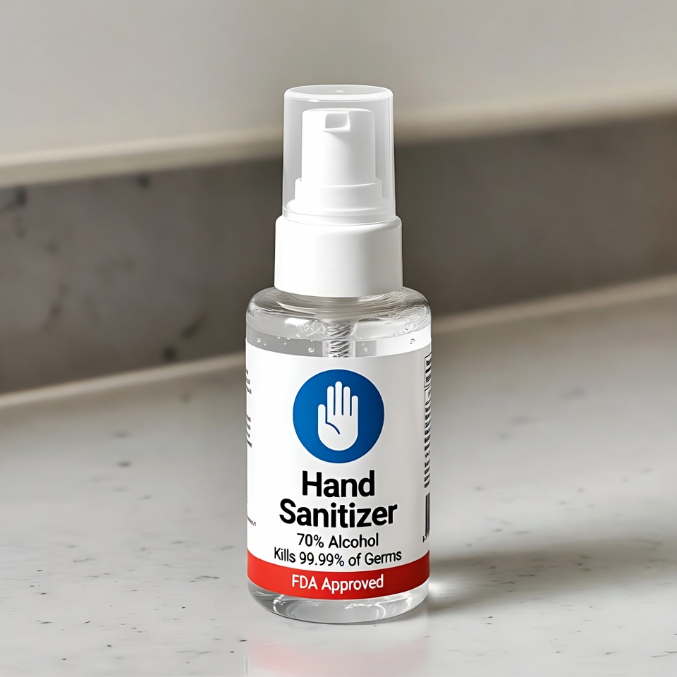 70 percent, FDA approved, alcohol, antibacterial, cleanliness, clear bottle, convenience, counter, desinfection, germ protection, germs, hand sanitizer, health, household, hygiene, personal care, pump, safety, surface, wellness