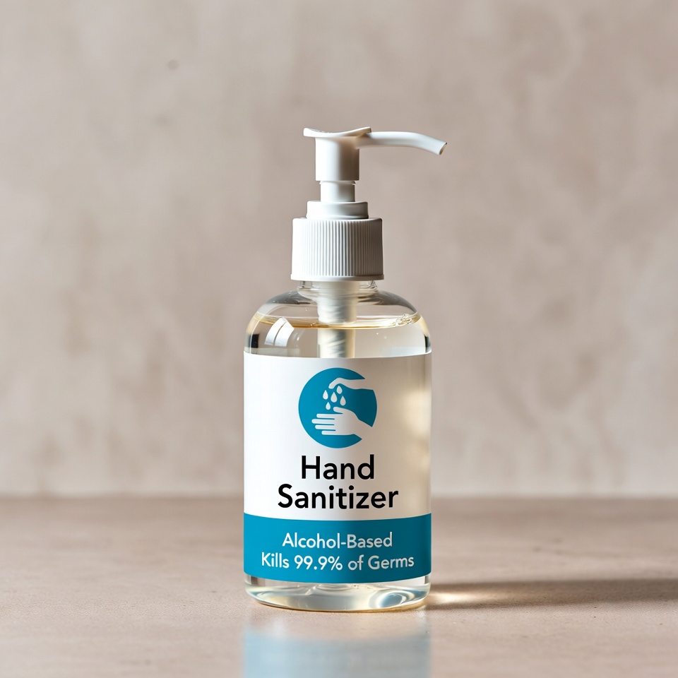Clear bottle of hand sanitizer is placed on a smooth table surface, emphasizing hygiene and cleanliness.