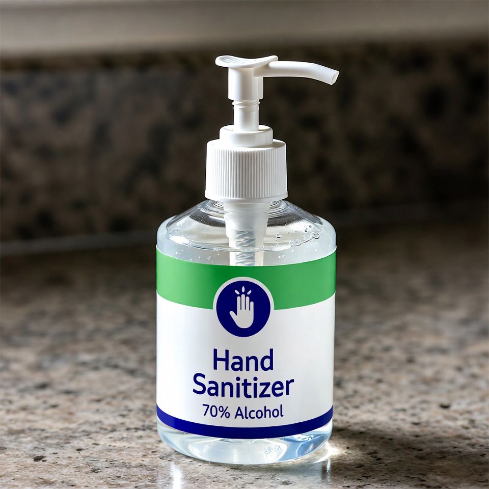 Hand sanitizer bottle on countertop