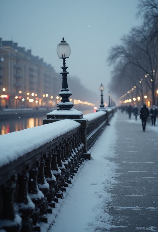 ambiance, architecture, city, cold, evening, glow, light, pathway, people, reflection, river, sidewalk, snow, snow-covered, snowflakes, street lamps, tranquility, trees, walking, winter