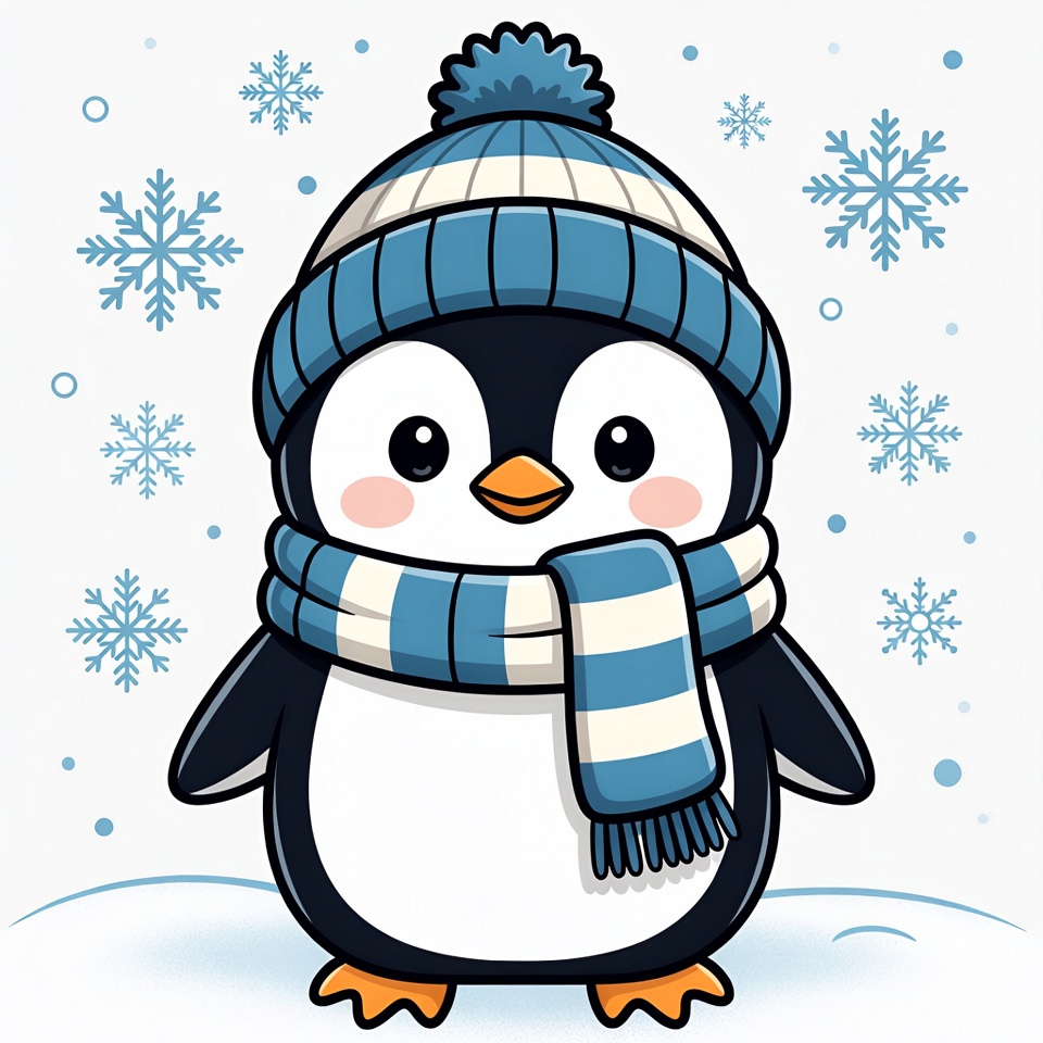 A charming penguin wearing a blue and white hat and scarf stands in a snowy landscape surrounded by snowflakes, enjoying a winter day.
