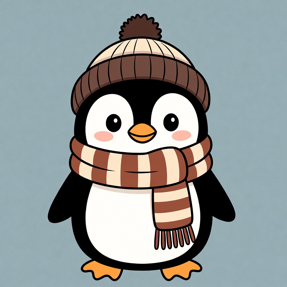 A cheerful penguin dressed in a brown hat and striped scarf stands warmly against a light blue background, embodying the spirit of winter.