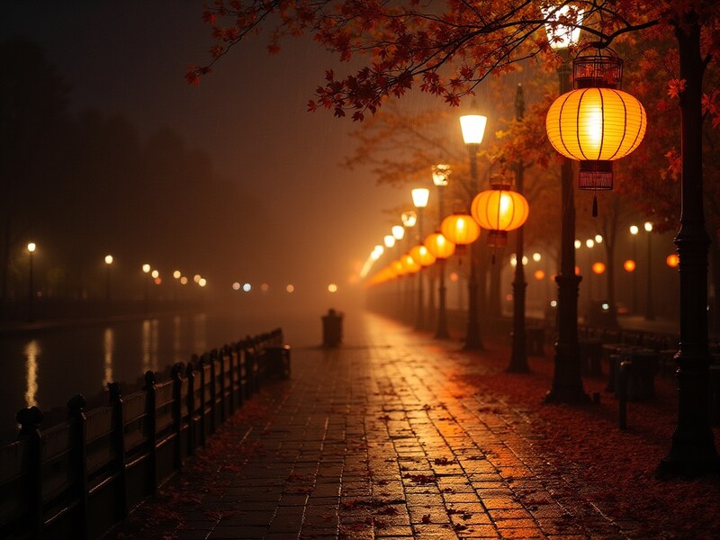 Warm orange lanterns illuminate a peaceful riverside path lined with trees. The quiet atmosphere offers a calm retreat on an autumn night.