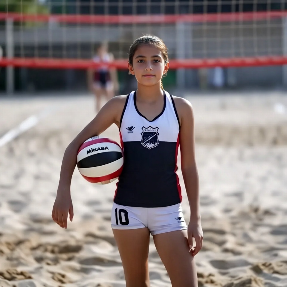 A girl stands on the sandy beach holding a volleyball. She wears a sporty outfit and focuses on the game under the sun.