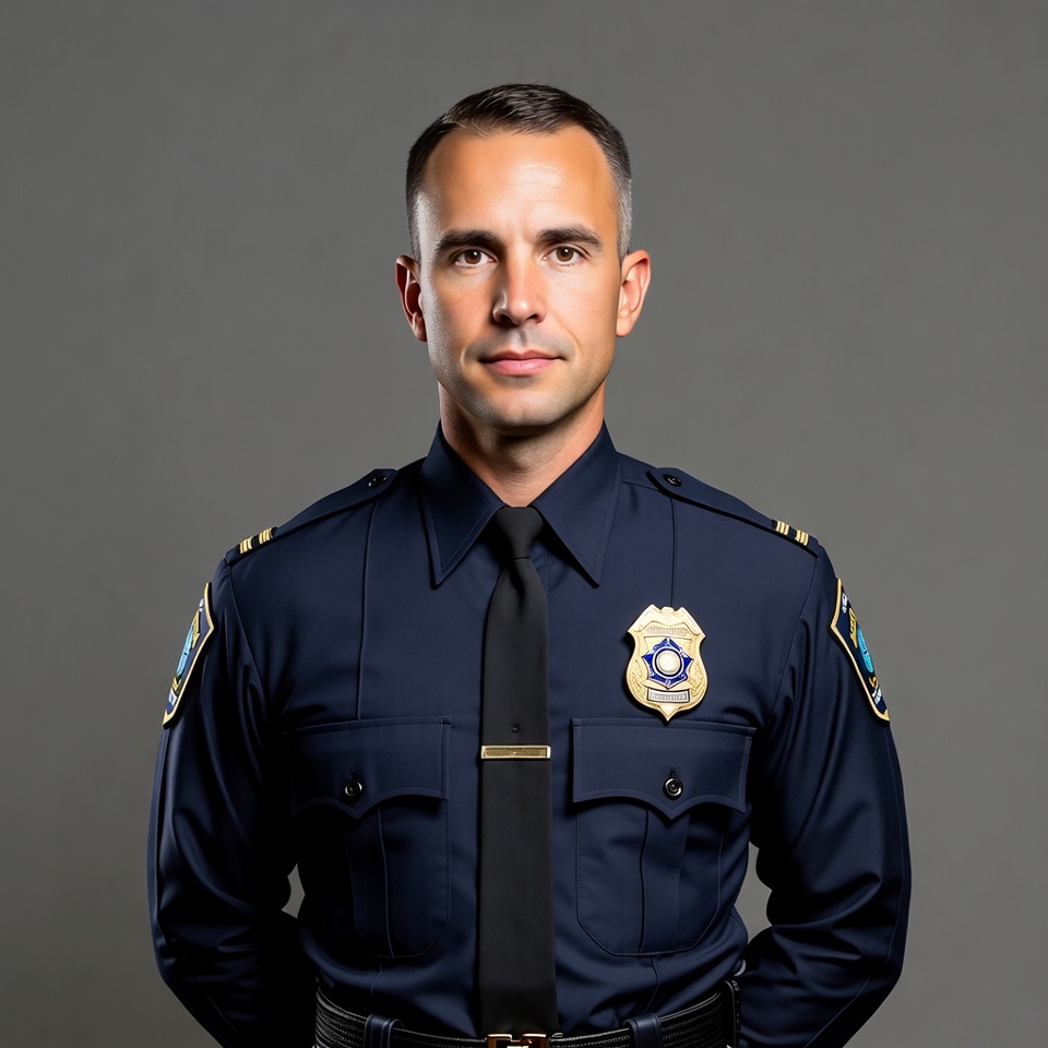 A police officer stands confidently in uniform against a neutral background. His expression reflects professionalism and readiness.
