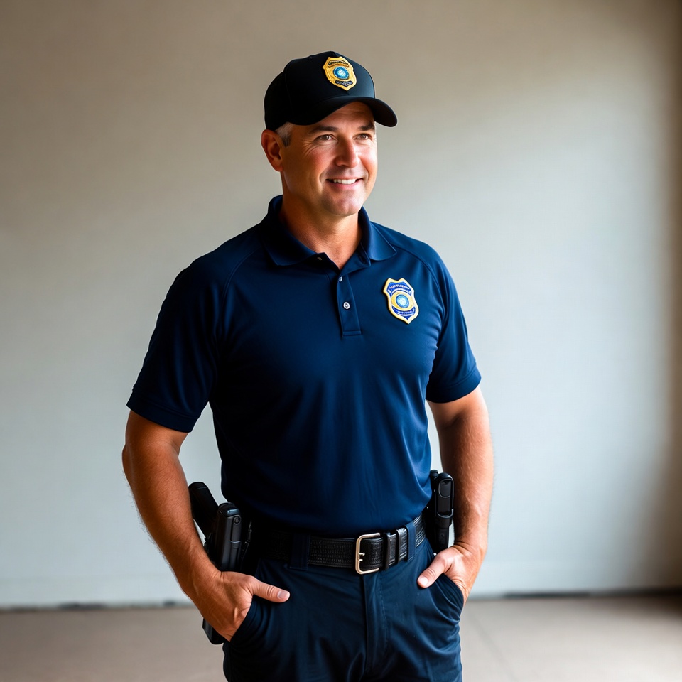 Smiling officer in uniform stands confidently