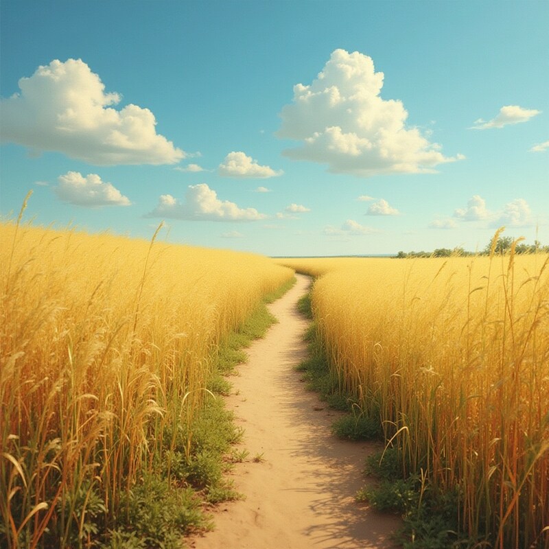 A sandy path winds through golden wheat fields under a clear blue sky filled with fluffy white clouds. It invites exploration and adventure.
