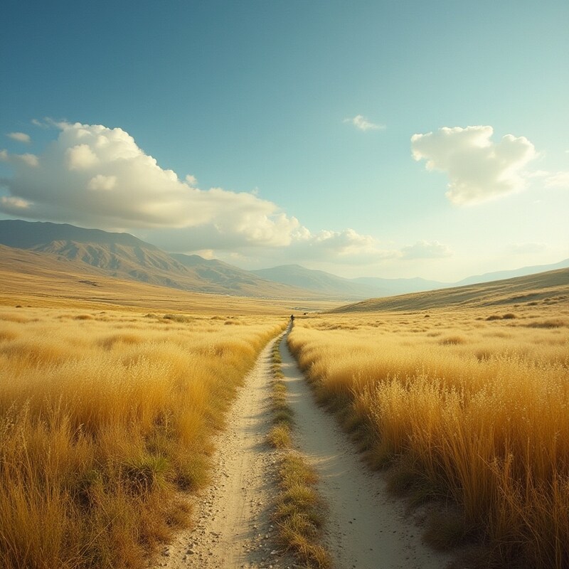 adventure, blue sky, clouds, dirt path, exploration, golden grass, grassland, hills, horizon, journey, landscape, nature, outdoor, peaceful, person, scenery, solitude, sunny day, tranquility, walking