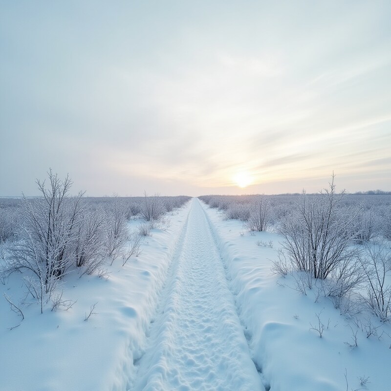 bushes, chilly, cold, frost, landscape, morning, nature, outdoor, path, remote, rural, scenery, serene, sky, snow, sunlight, sunrise, tranquil, white, winter