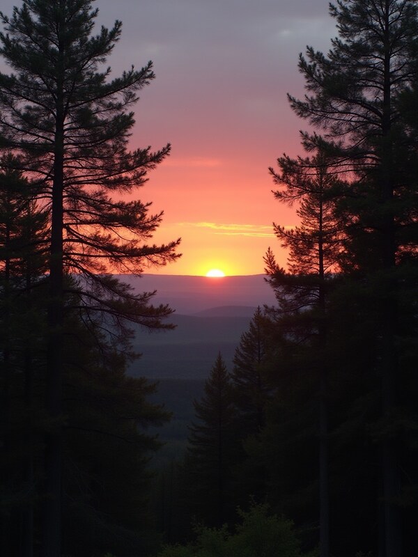 A vibrant sunset illuminates the sky, framed by tall pine trees in the mountains. The colors blend beautifully as night approaches.