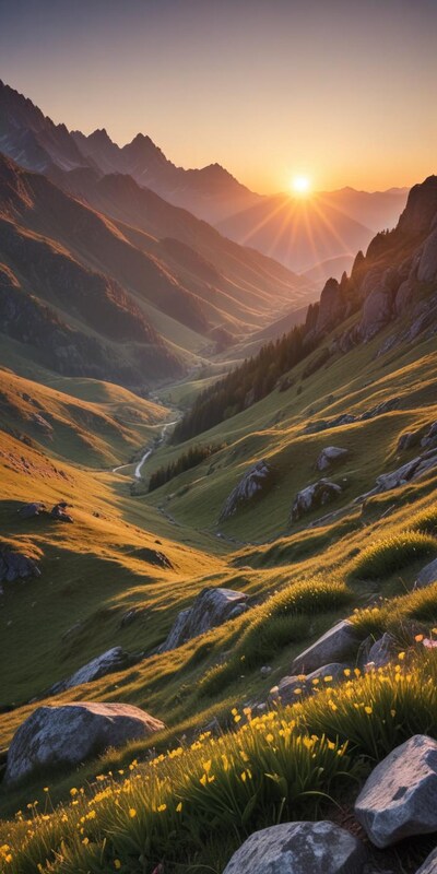 Warm sunlight bathes the green valley as it stretches between peaks, with a winding stream reflecting the golden hues of sunset.