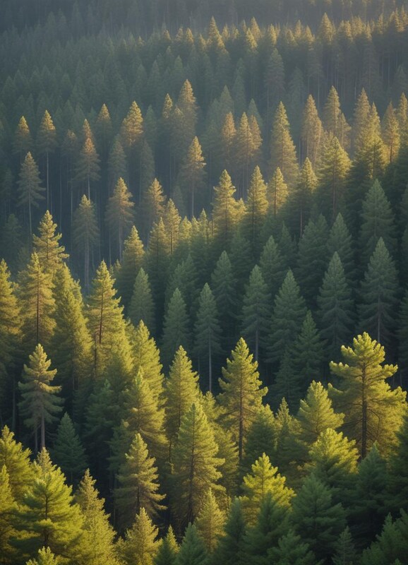 Lush green pine trees fill the landscape at sunrise, creating a serene atmosphere with soft light piercing through the forest canopy.